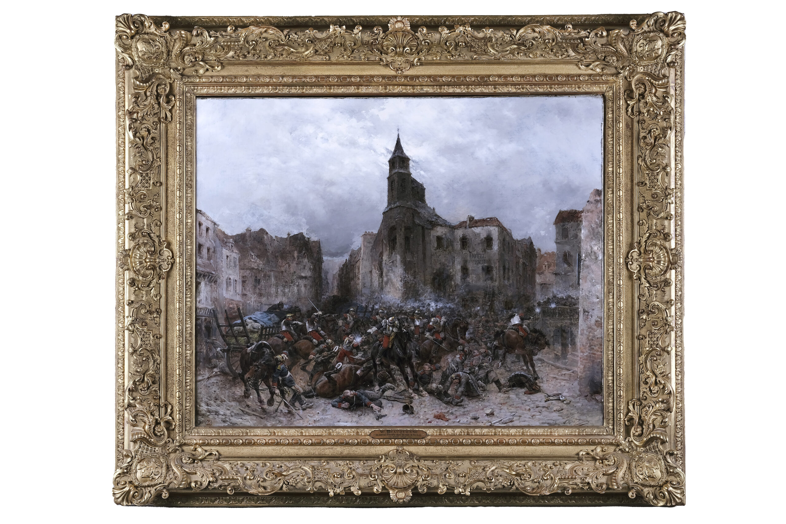 Représentant un combat dans les rues de Verdun entre les belligérants prussiens et français, cette scène développe l’iconographie du siège de Verdun de 1870. Selon Cédric Spagnoli, professeur d’histoire et spécialiste de la période : « La date (août 1870) rappelle un épisode du siège de Verdun suivant le premier bombardement (24 août 1870) : la prise d’un convoi allemand égaré dans le Faubourg pavé, relaté, entre autres, par l’abbé Gabriel dans son Journal du blocus et du bombardement de Verdun pendant la guerre de 1870 (paru à Verdun en 1872). La mention de l’escorte et la présence de chariots permettent d’appuyer cette hypothèse. ».